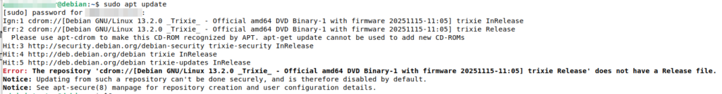 You are supposed to edit out the cdrom: source /etc/apt/sources.list: