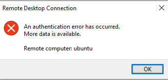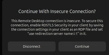 The native Remote Desktop (mstsc)’s graphical user interface do not contain the option to enable RDSTLS so it has to be written into an .rdp file then either loaded or executed. You will get this warning message if you use the entries from mstsc’s GUI alone to make the connection: